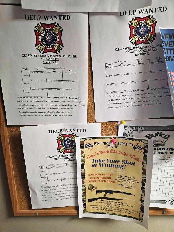 Our annual fall Buddy Poppy Fund Raising Drive will occur on Friday through Sunday, November 7th-9th, at the NAS Oceana Commissary, NEX, and Package Store. Each day from 1000-1600 hours, Post 392 members will be handing out Buddy Poppys and collecting donations to support this fund raising event. We need volunteers to sign up and fill 2-hour shifts at each location noted. Please be generous with your time, as those 2 hours pass quickly and we do this to support our veterans in need! You're welcome to bring family members to help! The sign up sheets are now posted for you to fill your spot!