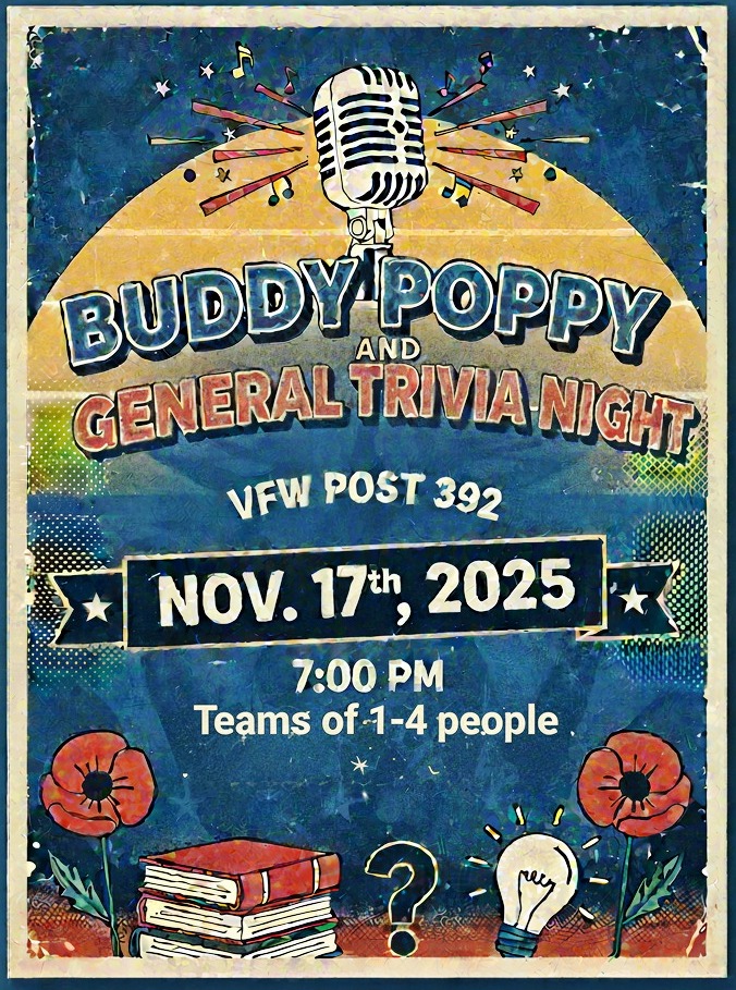 The Monthly trivia for November will be rescheduled to the 17th of November at 7pm. It will be a Buddy Poppy themed trivia but will have A LOT of general trivia mixed in as well. Hope to see a lot of people out for that one before the holiday. We will have cans to donate to Buddy Poppies; anyone dressed in buddy poppy attire will get 10 extra points for their team. Please come out and support and have a great time with us all.