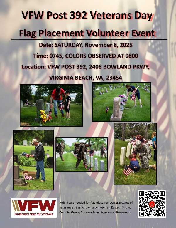 Please join us on November 8th at 0745 at VFW Post 392, where we will observe colors at 0745. At 0800 we will disburse to five local cemeteries, where we will honor the Veterans of our community by placing flags at their gravesites. Refreshments and lunch will be served immediately following. Click on the flyer below to see a full size copy of it.