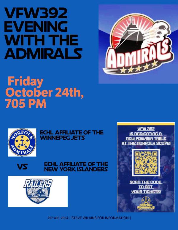 Senior Vice Commander Steve Wilkins has worked with the Norfolk Admirals to set up and dedicate a POW/MIA table at the Opening Night game on Friday, October 24th. We will dedicate the table before the game on the ice, allowing us to take pictures and other items. The table will then be moved to its permanent location in the scope. This has been a long time coming and a very big deal for not only the Admirals, but for our Vets and VFW 392, but for the VFW as a whole. The game is slated to be a sellout, so I was able to reserve 30 seats that are all together. If you scan the QR code on the flyer below, or click here, you can buy your tickets. They will be sent directly to your phone, allowing you to sit with the group. Ticket prices have increased somewhat this year, but $5 of every ticket we buy of those 30 will go back to our Post. it is going to be a great night for all, having something that we have dedicated to our military comrades, that will stand for a very long time. There will be a plaque that says that VFW 392 dedicated the table hung over the table as well. Commander Kevin Hebert, Sr Vice Commander Steve Wilkins, and other Post Officers will perform the ceremony to dedicate the table before the game. This is one event that you don't want to miss out on.