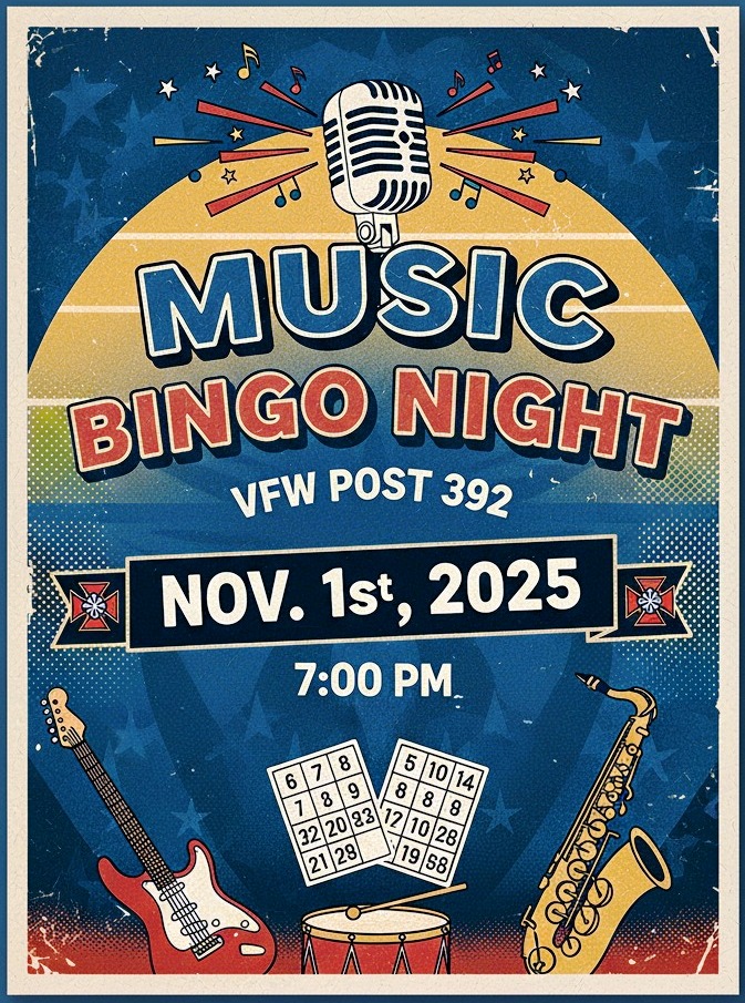 Join us at VFW Post 392 for our third evening of MONTHLY MUSIC BINGO!!! That's right! Our illustrious SVP and Social Event Coordinator Steve "Good Steve" Wilkins, after doing some fine tuning of issues noted on the first and second nights will host the second of what we hope will be many evenings of fun by combining music and bingo into an exciting game!! This event is open to all Post and Aux members