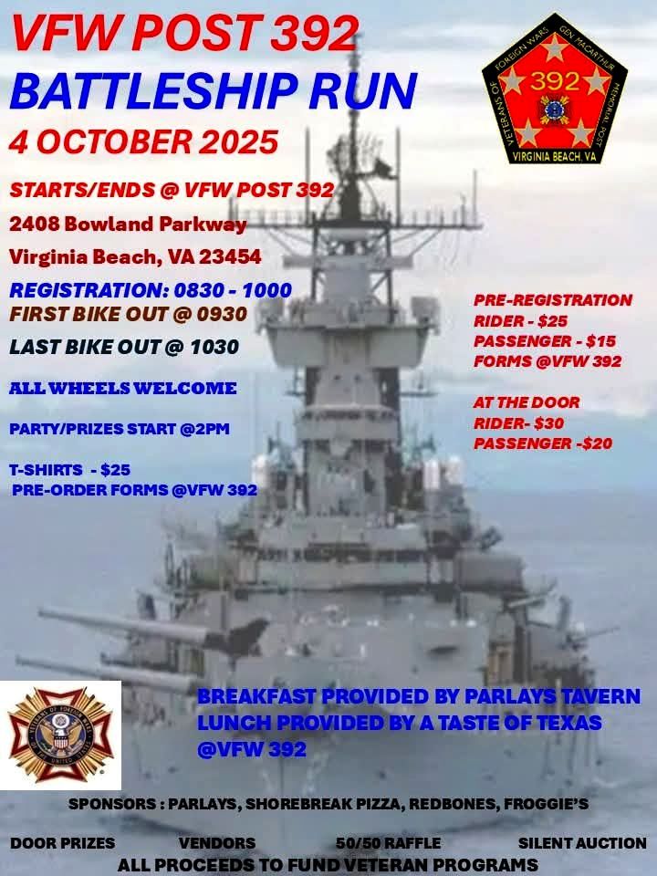 04 OCT, 0830, VFW POST 392 10TH ANNUAL BATTLESHIP RUN FUND RAISER EVENT. SEE FLYER BELOW FOR EVENT INFORMATION.