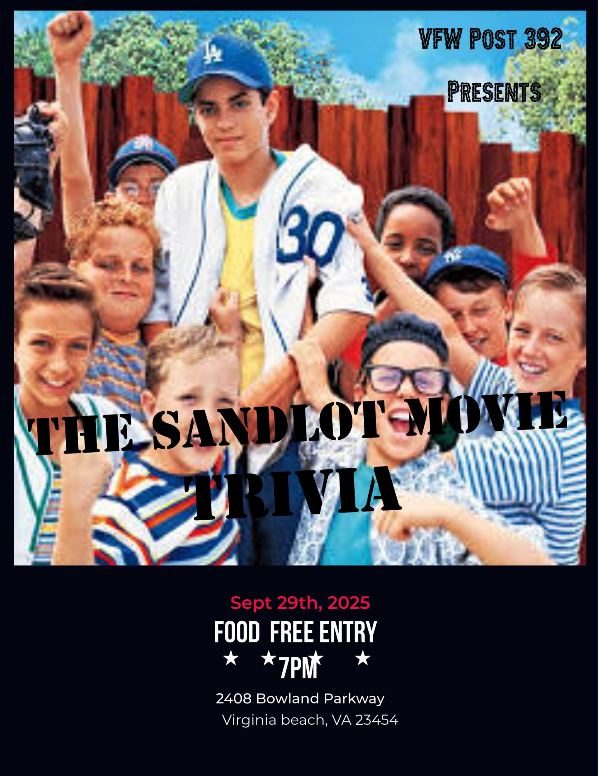 29 SEP, 1900-2100, MONTHLY TRIVIA NIGHT – SUBJECT IS "THE SANDLOT" BASEBALL THEMED MOVIE. TEAMS OF 1-4 PLAYERS. EXTRA POINTS FOR DRESSING UP. PRIZES AWARDED. SEE BELOW FOR DETAILS.