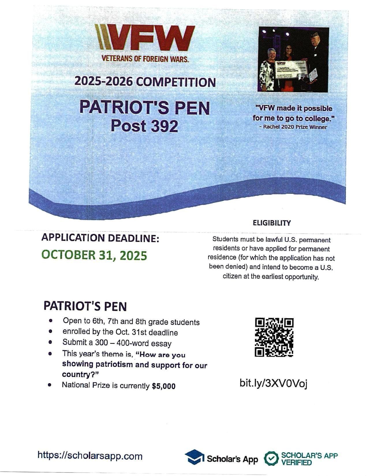 Patriot’s Pen - Students in grades 6-8 may enter the VFW’s Patriot’s Pen youth essay contest for a chance to win their share of more than $1.4 million in state and national awards. The 2024-25 theme is: "My Voice in America's Democracy?" Each first-place state winner receives a minimum of $500 at the national level and the national first place winner wins $5,000. The essay contest encourages young minds to examine America’s history, along with their own experiences in modern American society, by drafting a 300- to 400-word essay based on a patriotic theme. Entrants are due to VFW POST 392 by midnight, Oct. 31, 2024. Before submitting your essay, read the rules and eligibility requirements at Youth Scholarships - VFW.