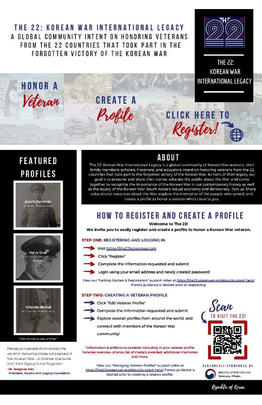 Our organization strives to preserve the memory of the Korean War and those who fought in it.  With this goal in mind, our newest project, THE 22  https://the22koreanwar.org/ , is a website designed to create an online community that honors and memorializes the service of all those who fought in the Korean War.  We hope to have profiles from all 22 participating nations in the war and eventually create lesson plans so that the Korean War has its rightful place in history classes across the country.
