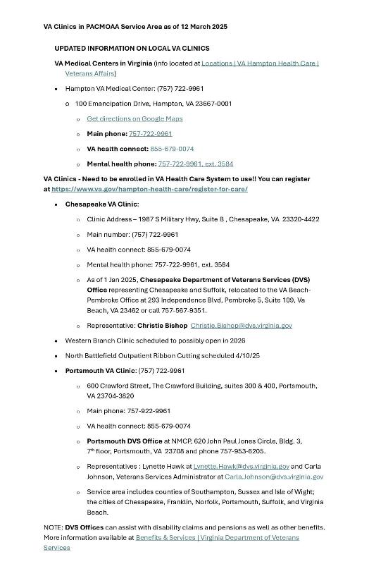 Scroll down to just above the Tricare info to see the updated list of VA Clinics in PACMOAA Service Area as of 12 March 2025