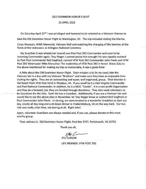On April 22nd, 2023, VFW Post 392 member Stu Carson (Command Master Chief, USN, Retired) was one of several bus loads of veterans honored with a free trip to the USMC Museum in Quantico VA and multiple memorials in Washington D.C. as part of Old Dominion Honor Flight Mission #4. Stu was escorted by then Past Post 392 Commander Troy Wagers. Below is a letter Stu wrote detailing his trip and thanking those involved in the ODHF mission. To see a full size copy of the letter, simply click on it to open it. Our thanks to Stu for his gracious words!!